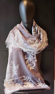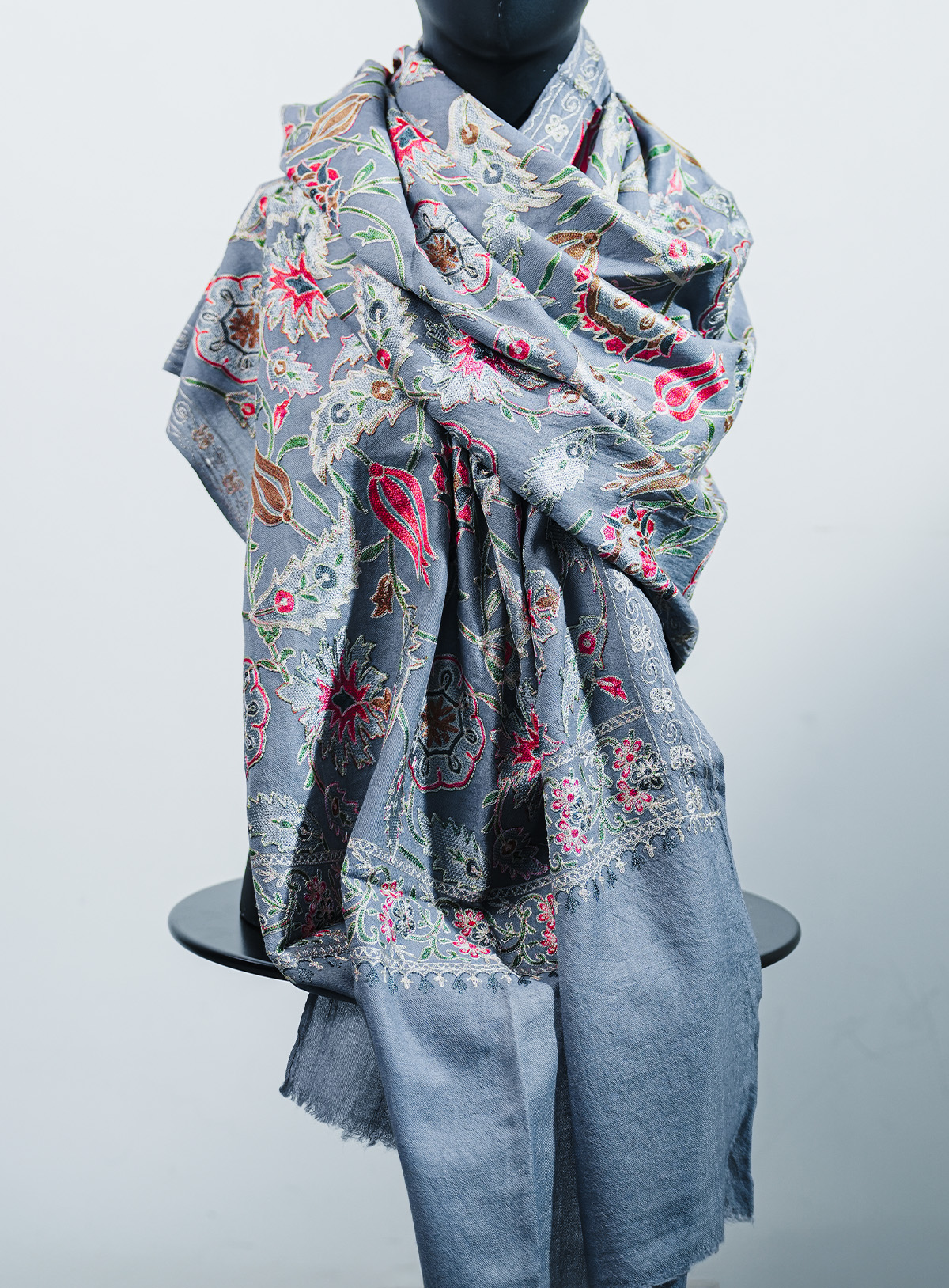A beautiful ash gray stole with all-over machine floral pattern in shades of pink, red, and green, providing a soft yet colorful look.