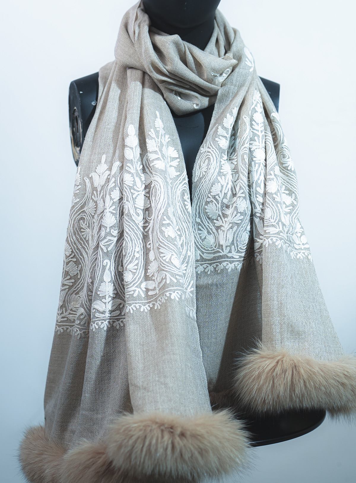 A luxurious beige stole with a wide, intricate white floral and paisley ari border, finished with a stylish and elegant fur trim