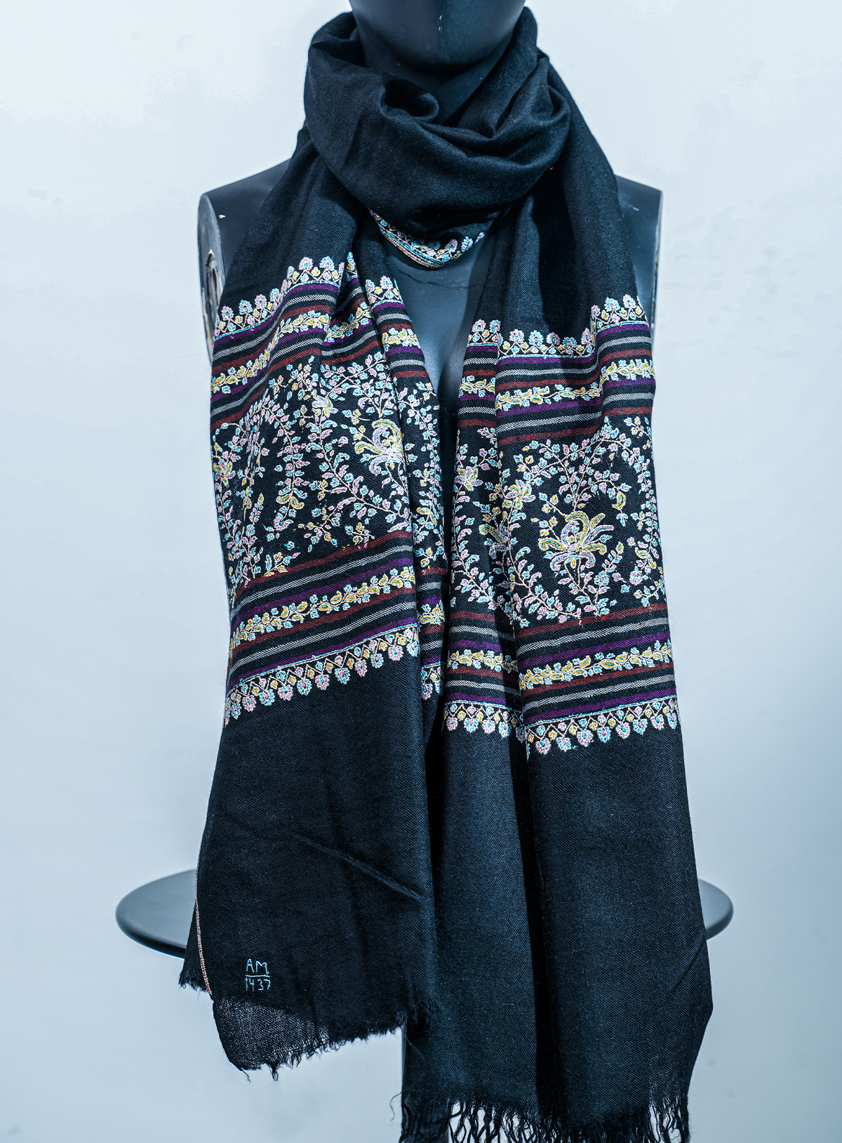 A sophisticated black Pashmina stole featuring a broad, multicolored embroidered border with intricate floral and paisley designs and fringed edges.