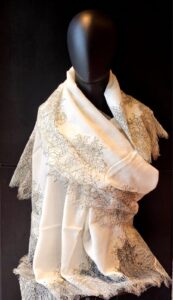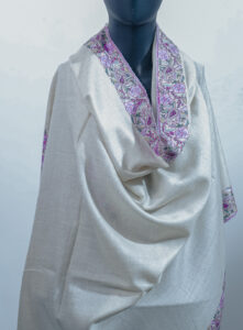 A striking peach colour shawl featuring a wide Hand embroidered border in blue. Also available in light grey, dark grey, nude brown, and beige.