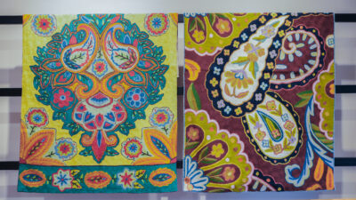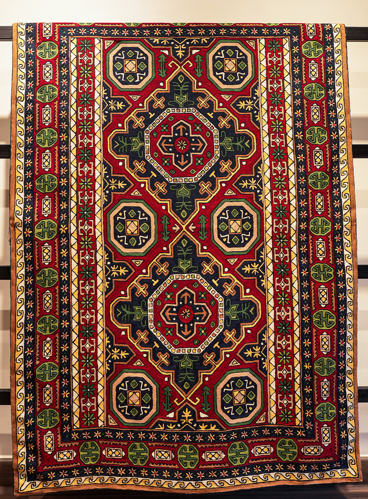 A vibrant Kashmiri rug featuring bold hand ari work rug kilm pattern with red, green, and navy.